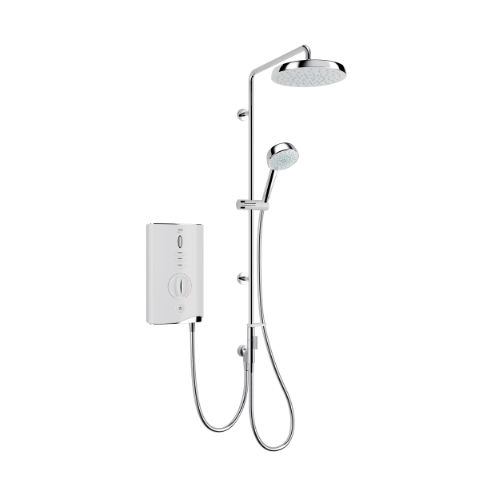 Flip between four new spray modes on the 120mm handset - ranging from full coverage to a powerful massage spray. Separate power and temperature controls let you fine-tune your perfect shower experience. From a cool blast, to a hot soak - and every kind of shower in between. The simple, push-button on/off offers quick and easy operation, while allowing you to keep your preferred power and temperature settings ready to go for your next shower. Mira Sensi-flo technology monitors your shower's water flow rate to detect blockages in the hose or showerhead - automatically shutting off the heating element to help prevent scalding from surges. So you can enjoy safer showering. Mira Clearscale technology features a unique heating element design helping to prevent the build-up of limescale inside the shower unit by up to 50% ensuring a longer lasting and better performing shower. Mira Opti-flo technology optimises water flow throughout the year - adjusting to combat seasonal changes in your mains water temperature. So there's less fiddling with settings. Thanks to the adjustable slide bar, it's easy to cover fixing holes in walls or tiles from previous fittings - so you can upgrade to powerful Mira electric shower performance without compromising the look of your bathroom. Manufacturer Stock Code:1.1746.823 EAN Code:5013181126907 Length:675 mm Width:103 mm Height:223 mm Weight:3.26 kg Sub-Category:Electric showers Colour:White Brand:Mira Warranty:2 Years Range:Sport Category:Showers Room:Bathroom Type:Exposed